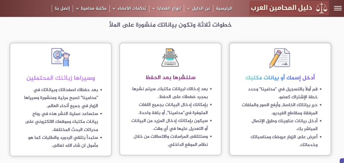 - Provide accurate and up-to-date information about registered Arab lawyers.